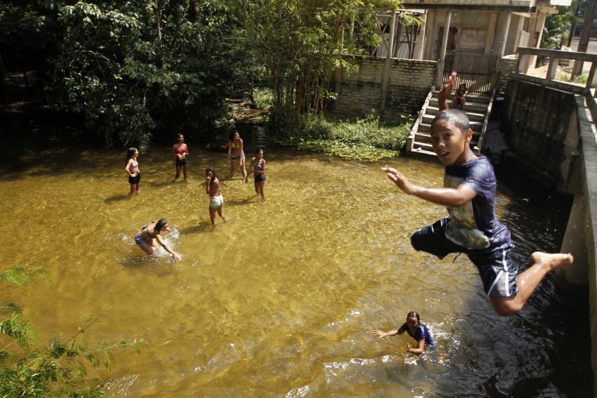 no pequeno igarapé que corre no fundo da propriedade. O divertimento é
